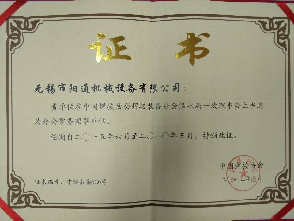熱烈祝賀無錫市陽通機(jī)械設(shè)備有限公司連任中國(guó)焊接協(xié)會(huì)焊接裝備分會(huì)常務(wù)理事單位